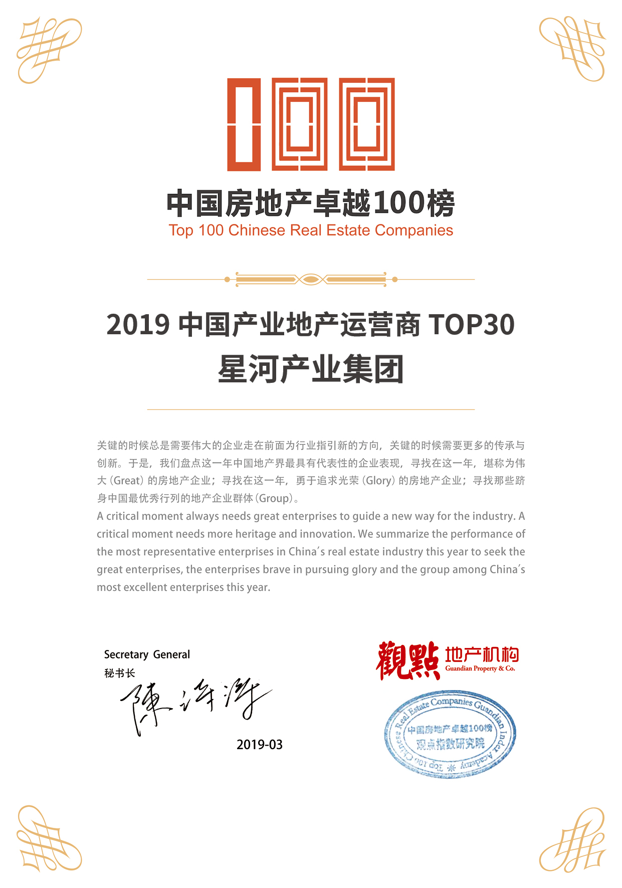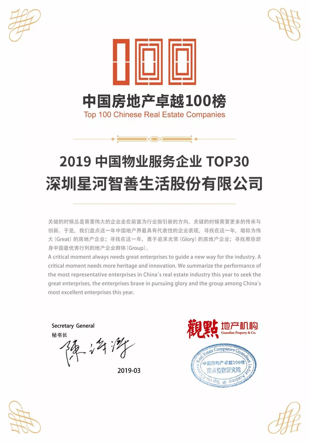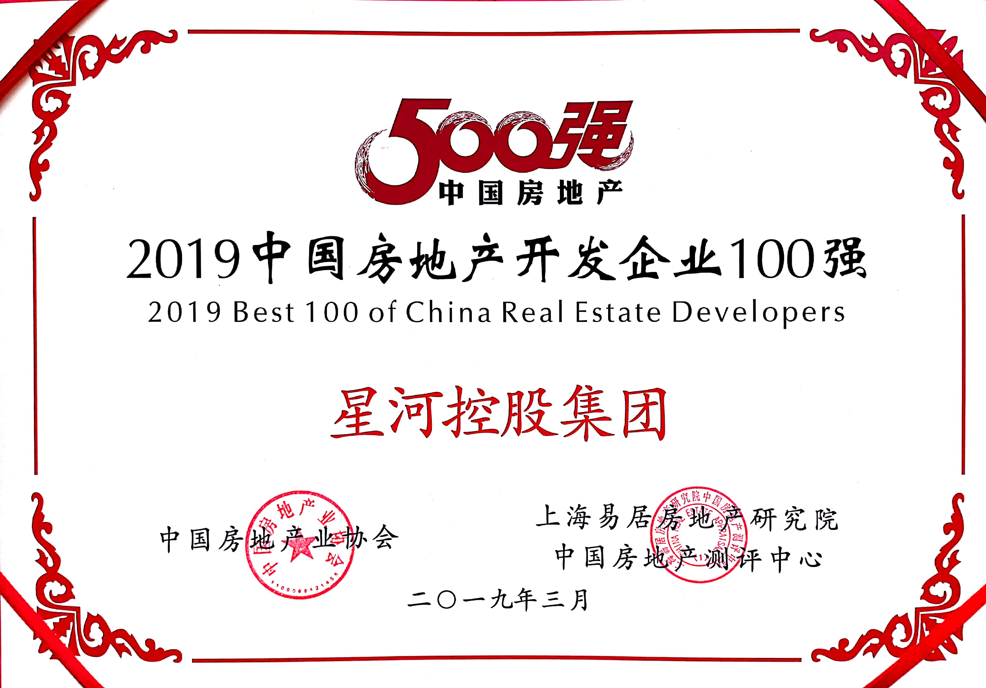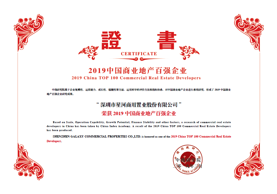On March 19, 2019, the list of "Top 100 Chinese Real Estate Companies in 2019" was released by the Chinese TOP 10 Real Estate Companies Research Group, which is made up of the Development Research Center of the State Council, the Real Estate Research Institute of Tsinghua University, and China Index Academy. Due to its outstanding, comprehensive strengths and good reputation, Galaxy Holding Group has been included on the list for eight consecutive years.